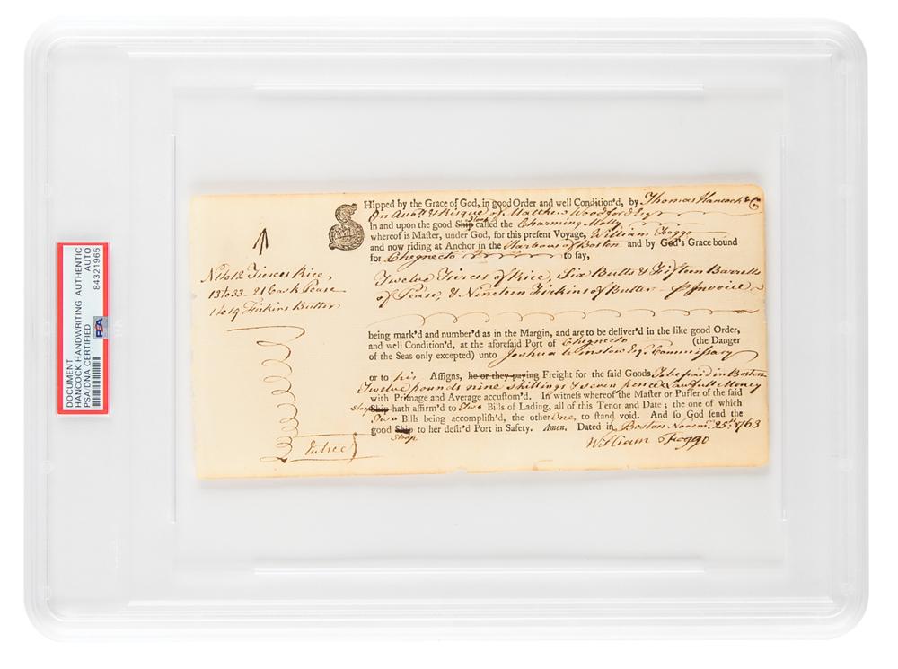 Partly-printed third-person ADS, signed within the text on behalf of his uncle's company, "Thomas Hancock & Co.," one page, 9 x 4.5, November 25, 1763. A bill of lading, mostly filled out by Hancock, in part: "Shipped by the Grace of God, in good Order and well Condition'd, by Thomas Hancock & Co?.upon the good Sloop called the Charming Molly, whereof is Master, under God, for this present Voyage William Foggo and now riding at Anchor in the Harbour of Boston and by God's Grace bound for Chignecto, to say, Twelve Tierces of Rice, Six Butts & Fifteen Barrells of Pease, & Nineteen Firkins of Butter." In fine condition. Encapsulated in a PSA/DNA authentication holder.