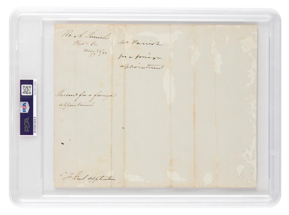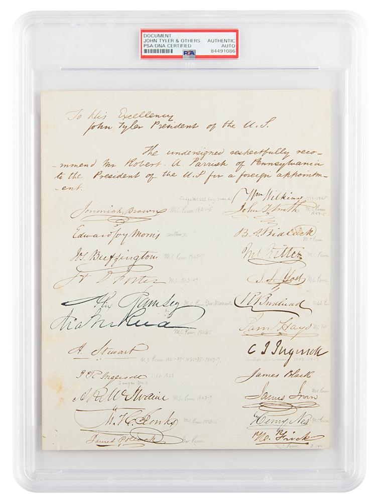 Unsigned handwritten endorsement by President John Tyler, "Mr. Parrish for a foreign appointment," penned on the reverse of a letter sent to him, one page, 7.75 x 9.75, docketed May 23, 1844. The letter, in part: "The undersigned respectfully recommend Mr. Robert A. Parrish of Pennsylvania to the President of the U.S. for a foreign appointment." Signed below by 23 members of the 28th United States Congress: Jeremiah Brown, Edward Joy Morris, Joseph Buffington, Henry D. Foster, Alexander Ramsey, Charles M. Read, Andrew Stewart, Joseph R. Ingersoll, Abraham R. McIlvaine, Michael H. Jenks, James Pollock, William Wilkins, John T. Smith, Benjamin A. Bidlack, John Ritter, Jacob S. Yost, Richard Brodhead, Samuel Hays, Charles J. Ingersoll, James Black, James Irvin, Henry Nes, and Henry Frick. In fine condition. Encapsulated in a PSA/DNA authentication holder.