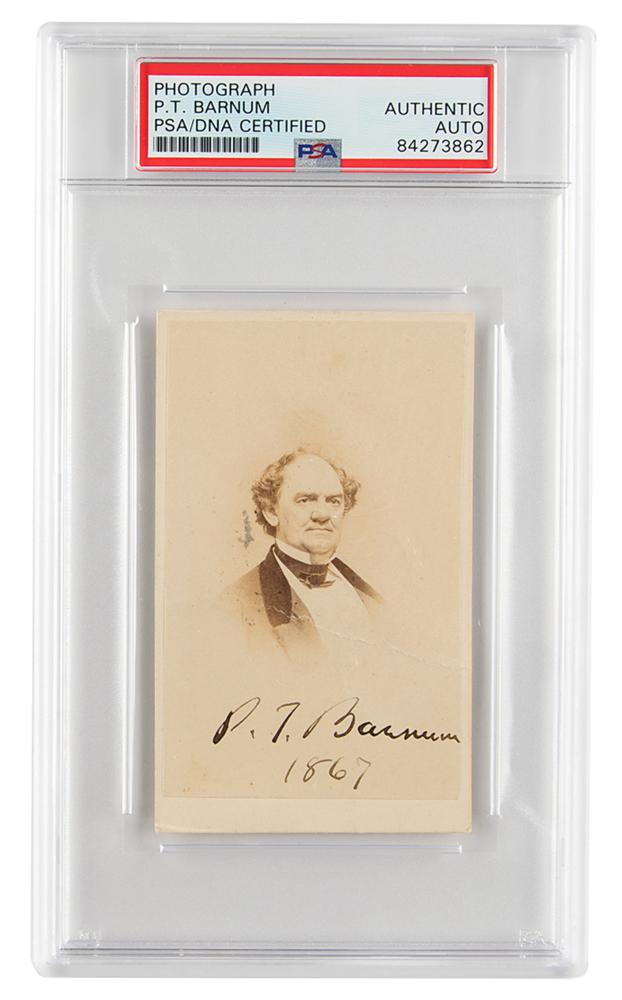 Uncommon 2.25 x 4 carte-de-visite photo of Barnum by Black & Case of Boston and Newport, signed below the image in ink, "P. T. Barnum, 1867," and also signed on the reverse, "Clinton, Jan'y 24/67, P. T. Barnum." In fine condition, with a light horizontal crease. A great portrait of the legendary showman boasting two fine autographs. Encapsulated in a PSA/DNA authentication holder.