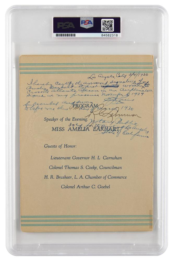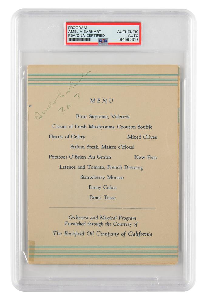 Program for a dinner organized by the Women's Traffic Club of Los Angeles in honor of Amelia Earhart, held at the Alexandria Hotel on November 8, 1929, 5.5 x 7.25, signed inside on the menu in fountain pen, "Amelia Earhart, T.A.T." The opposite side bears a notary stamp and signature, and handwritten notations stating that the program was signed on the date of the dinner. In fine condition, with a small piece of tape to a lower corner. Encapsulated in a PSA/DNA authentication holder.
