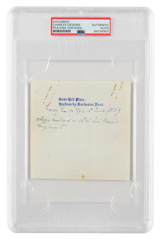 ANS signed “Mr. Dickens,” one page, 4.25 x 4.25, Gad's Hill Place letterhead, June 28, 1869. Handwritten note by Charles Dickens, in full: "Cheque enclosed with Mr. Dickens's compliments." In fine condition, with two rusty paperclip impressions to the top edge. Encapsulated in a PSA/DNA authentication holder.