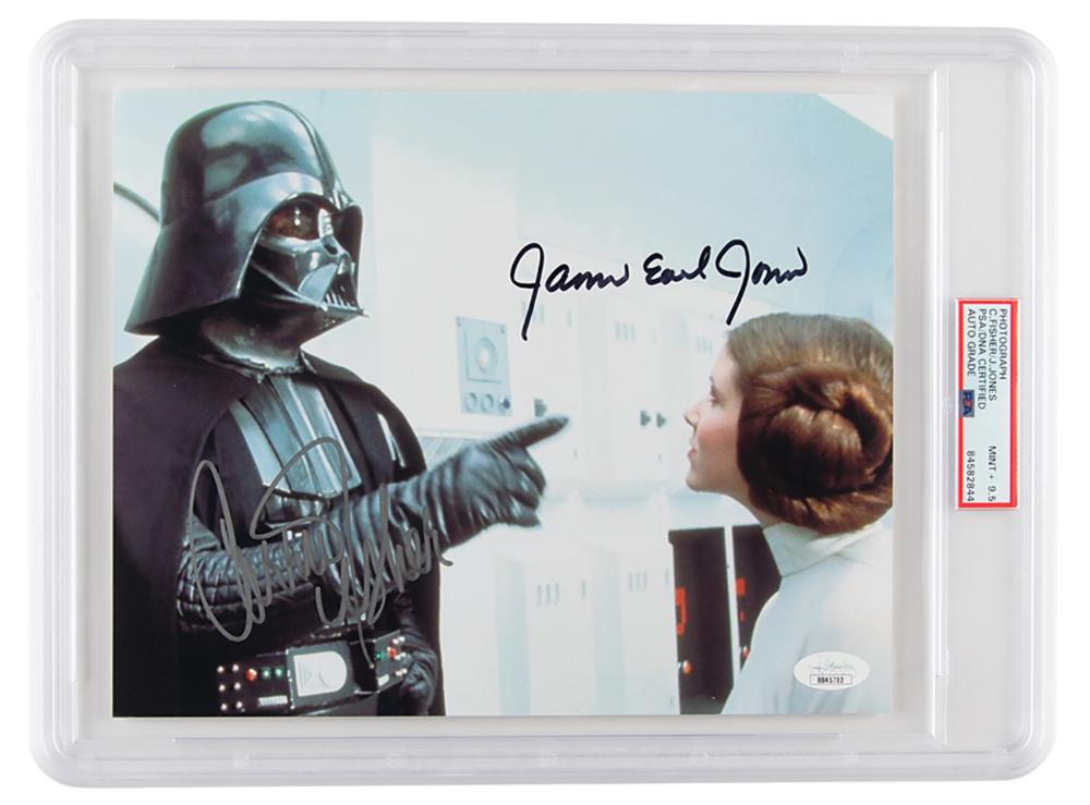 Color glossy 10 x 8 photo of Darth Vader conversing amiably with Princess Leia, signed in silver ink by Carrie Fisher and in black felt tip by James Earl Jones. In very fine condition, with a JSA label affixed to the lower right corner. Encapsulated and graded by PSA/DNA as "MINT + 9.5." Accompanied by a full letter of authenticity from JSA.