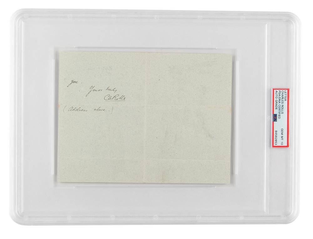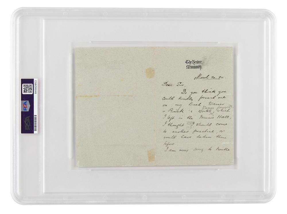 British businessman (1877-1910) who, with his partner Frederick Henry Royce, founded one of the most legendary firms in automotive history, and whose name became synonymous with the ultimate in automotive luxury and status. An ardent aviator, Rolls set a number of early aviation records, including the first non-stop double crossing of the English Channel. In the same year, 1910, Rolls became the first Briton (and only the eleventh person) to die in an aviation accident when the tail of his Wright Flyer broke off in flight. ALS signed “C. S. Rolls,” one page both sides, 4 x 6, The Hendre of Monmouth letterhead, March 20, 1894. Handwritten letter to a gentleman, in full: “Do you think you could kindly forward me on my Bach, Stainer and Rinck’s works, which I left in the Music Hall, I thought I should come to another practice, or would have taken them before. I am very sorry to trouble you.” In fine condition, with two small stains along the hinge. Encapsulated and graded by PSA/DNA as "GEM MT 10." Accompanied by a full letter of authenticity from JSA.