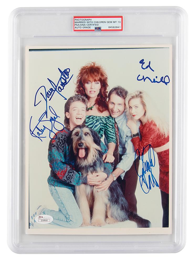 Color glossy 8 x 10 photo of the Married with Children cast, signed in blue felt tip by Ed O'Neill, Katey Sagal, Christina Applegate, and David Faustino. In very fine condition, with a JSA label affixed to the lower left corner. Encapsulated and graded by PSA/DNA as "GEM MT 10." Accompanied by a full letter of authenticity from JSA.