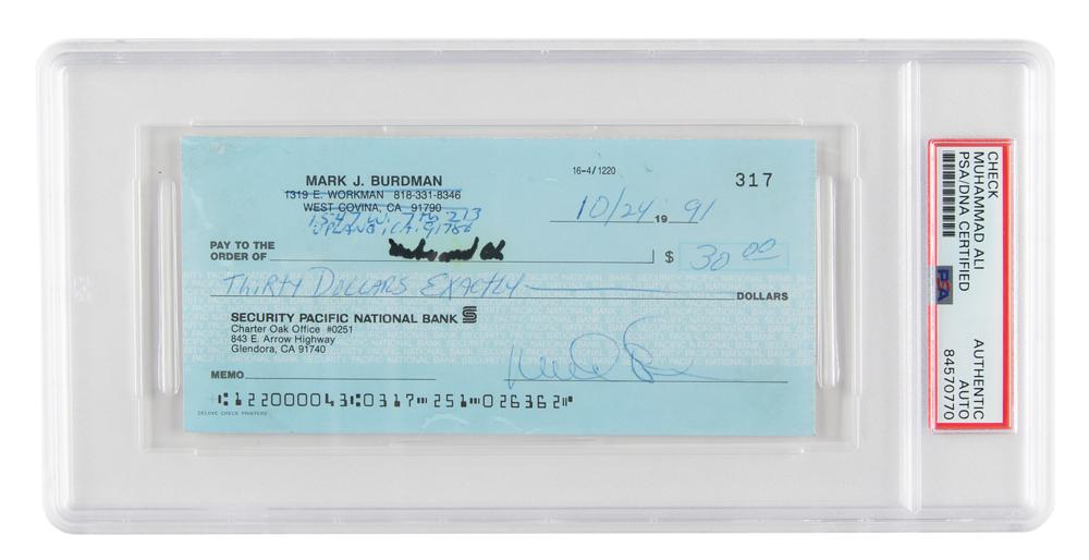 Personal check belonging to Mark J. Burdman, 6 x 2.75, October 24, 1991, paying $30 to Muhammad Ali, who signs his name in black felt tip in the payee field. In fine condition, with faint yellow haloing to Ali's signature. Encapsulated in a PSA/DNA authentication holder. Accompanied by a full letter of authenticity from JSA.