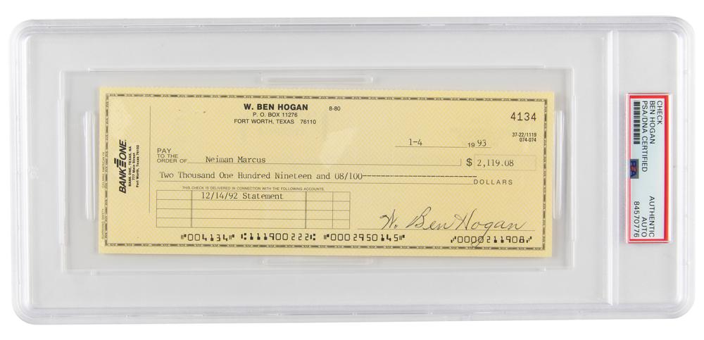 Personal check, 8.25 x 3, filled out in type and signed by Hogan, "W. Ben Hogan," payable to Neiman Marcus for $2,119.08, January 4, 1993. In fine condition. Encapsulated in a PSA/DNA authentication holder. Accompanied by a full letter of authenticity from JSA.