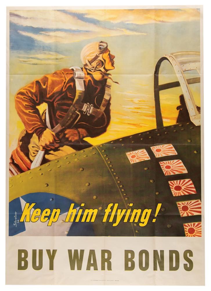 Stunning color 28.5 x 40 American WWII poster published in 1943 by the US Government Printing Office (1943-O-507063, WSS 740-B), featuring artwork by Georges Schreiber of a fighter pilot looking skyward from his cockpit, his plane featuring six ‘Rising Sun’ victory markings, with bold yellow and black text to the bottom reading: “Keep him flying!” and “Buy War Bonds.” In fine, folded condition.