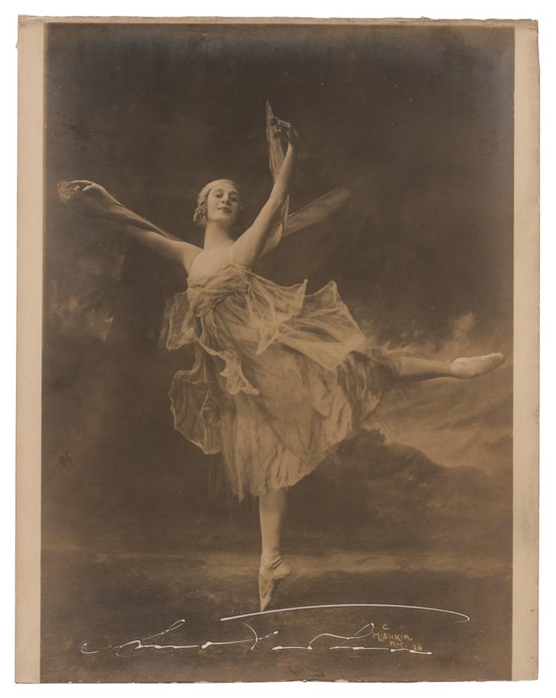 Vintage matte-finish 7 x 9 photo of Anna Pavlova by the Mishkin Studio of New York, signed in white fountain pen. In very good to fine condition, with trimmed edges and silvering to the background.