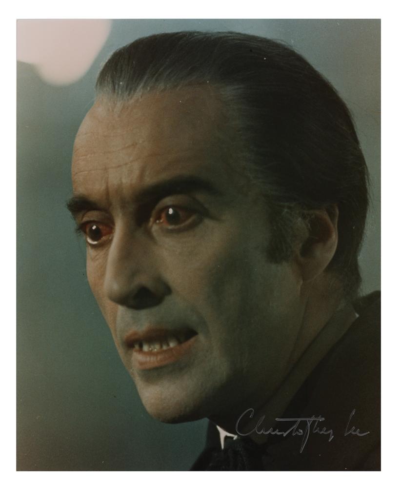 Color glossy 8 x 10 close-up photo of Christopher Lee as the bloodthirsty Count Dracula, signed in silver ink. In fine condition.