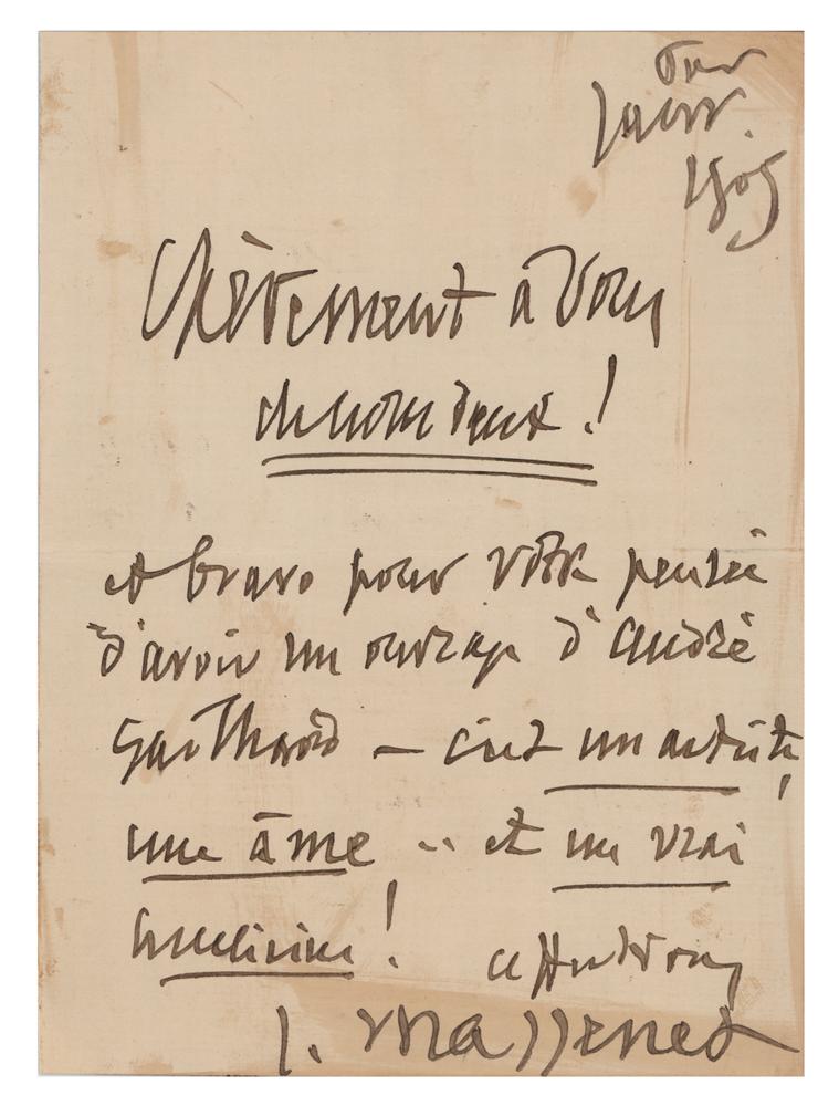 ALS in French, signed “J. Massenet,” one page, 4.75 x 6.5, June 1909. Untranslated handwritten letter by the celebrated composer. In fine condition, with slightly irregular toning.