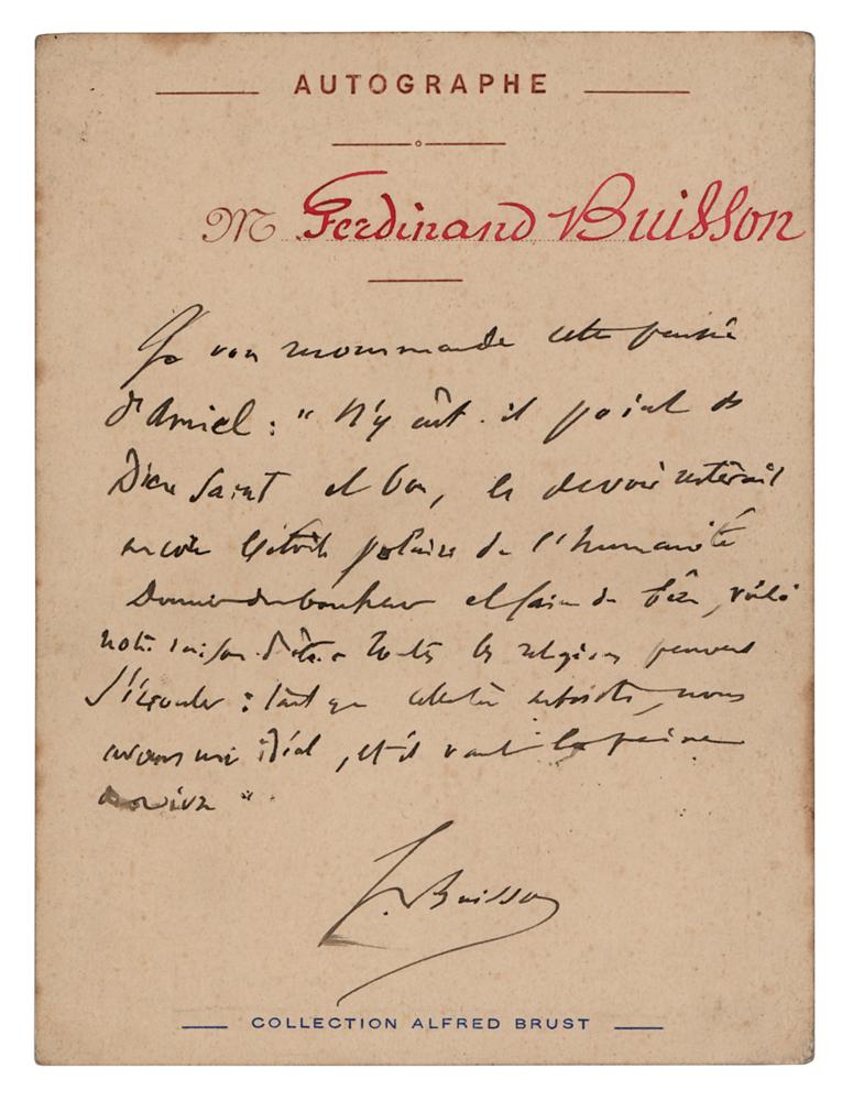 French academic and liberal politician (1841-1932) who helped build the modern French education system, and shared the 1927 Nobel Peace Prize with Ludwig Quidde. Uncommon ANS in French, signed “F. Buisson,” one page on a 4 x 5.5 stationery sheet imprinted with "Autographe, Collection Alfred Brust," no date. Handwritten note by the pioneering and influential educator, in full (translated): "I recommend to you this thought of Amiel: "Were there no holy and good God, duty would still remain the pole star of humanity. To give happiness and to do good, that is our reason. For all religions can collapse: as long as this one remains, we have an ideal, and it is worth living for.'" In fine condition.