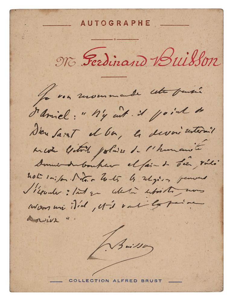French academic and liberal politician (1841-1932) who helped build the modern French education system, and shared the 1927 Nobel Peace Prize with Ludwig Quidde. Uncommon ANS in French, signed “F. Buisson,” one page on a 4 x 5.5 stationery sheet imprinted with "Autographe, Collection Alfred Brust," no date. Handwritten note by the pioneering and influential educator, in full (translated): "I recommend to you this thought of Amiel: "Were there no holy and good God, duty would still remain the pole star of humanity. To give happiness and to do good, that is our reason. For all religions can collapse: as long as this one remains, we have an ideal, and it is worth living for.'" In fine condition.