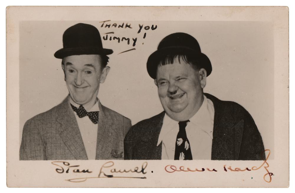 Vintage glossy 5.5 x 3.5 photo of the comedy duo side-by-side in their iconic bowler hats, signed and inscribed in fountain pen, "Thank you Jimmy! Stan Laurel" and "Oliver Hardy.” In fine condition, with some light postal impressions.