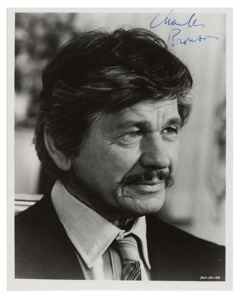 Appealing glossy 8 x 10 close-up photo of the popular silver screen vigilante, signed in blue felt tip, "Charles Bronson." In fine condition, with a few small surface impressions to the upper left corner.