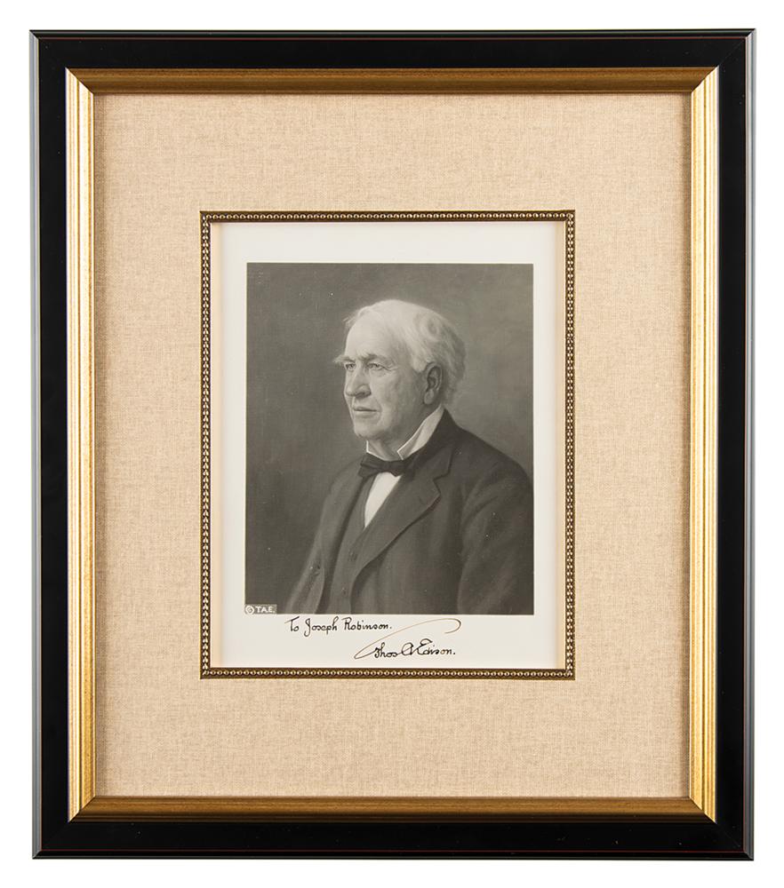 Superb vintage matte-finish 7.5 x 9.5 photo of an artist's portrait of Edison, signed and inscribed in the lower border in fountain pen with his iconic 'umbrella' signature, "To Joseph Robinson, Thos. A. Edison." Handsomely cloth-matted and framed to an overall size of 15.25 x 17.5. In fine to very fine condition. Edison's distinctly penned inscription and signature remain unusually bold.
