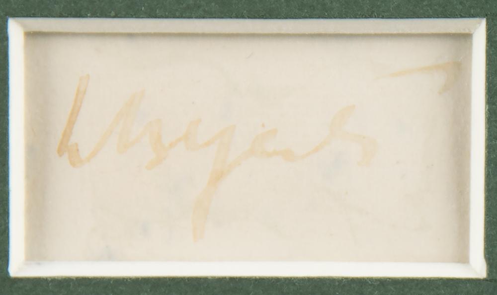 Vintage ink signature, "W. B. Yeats,” on an off-white 1.25 x .75 slip, matted and framed with a portrait and poem to an overall size of 10 x 12.5. In very good to fine condition, with the signature very faded, but still completely legible.