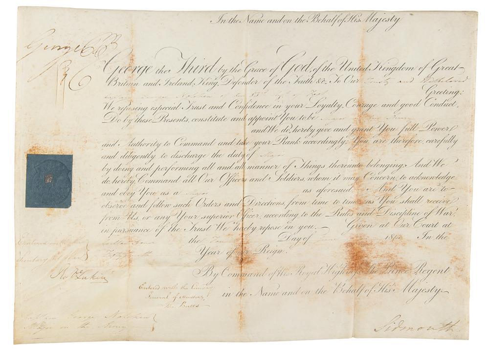 Partly-printed vellum DS, signed “George P. R.,” one page, 15.5 x 11.25, June 4, 1814. The future King George IV appoints "Captain George Nolcken of our 83rd Regt. of Foot?to be a Major in Our Army." Signed in the upper left corner by George as Prince Regent, and countersigned at the conclusion by Viscount Sidmouth. The blue seal affixed to the left side remains intact. In very good to fine condition, with scattered staining.