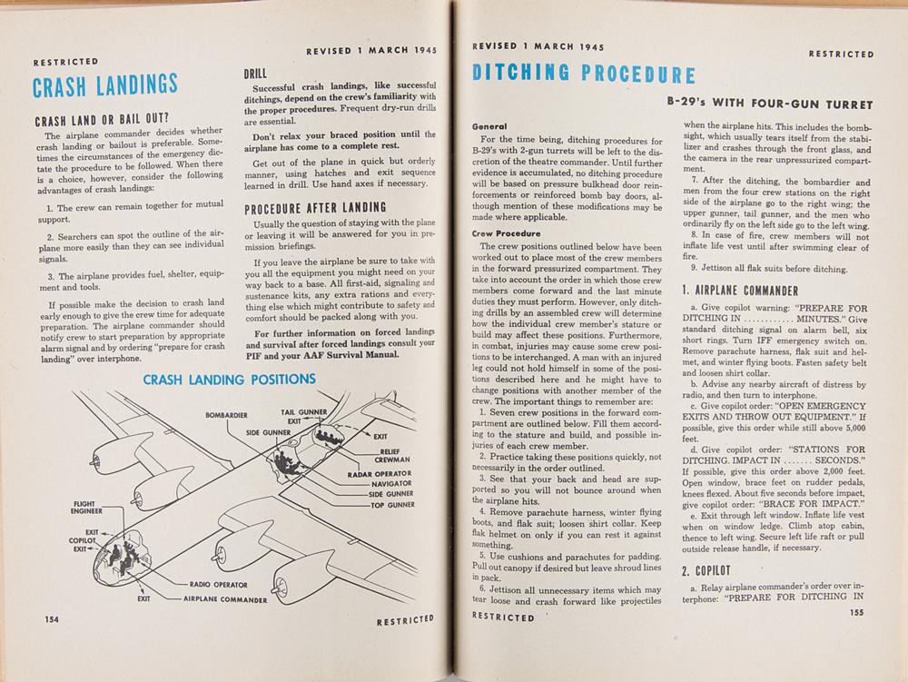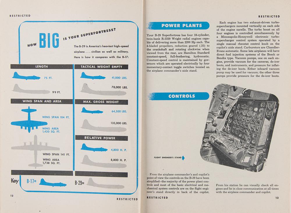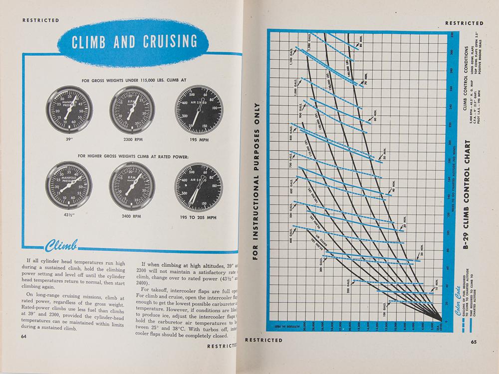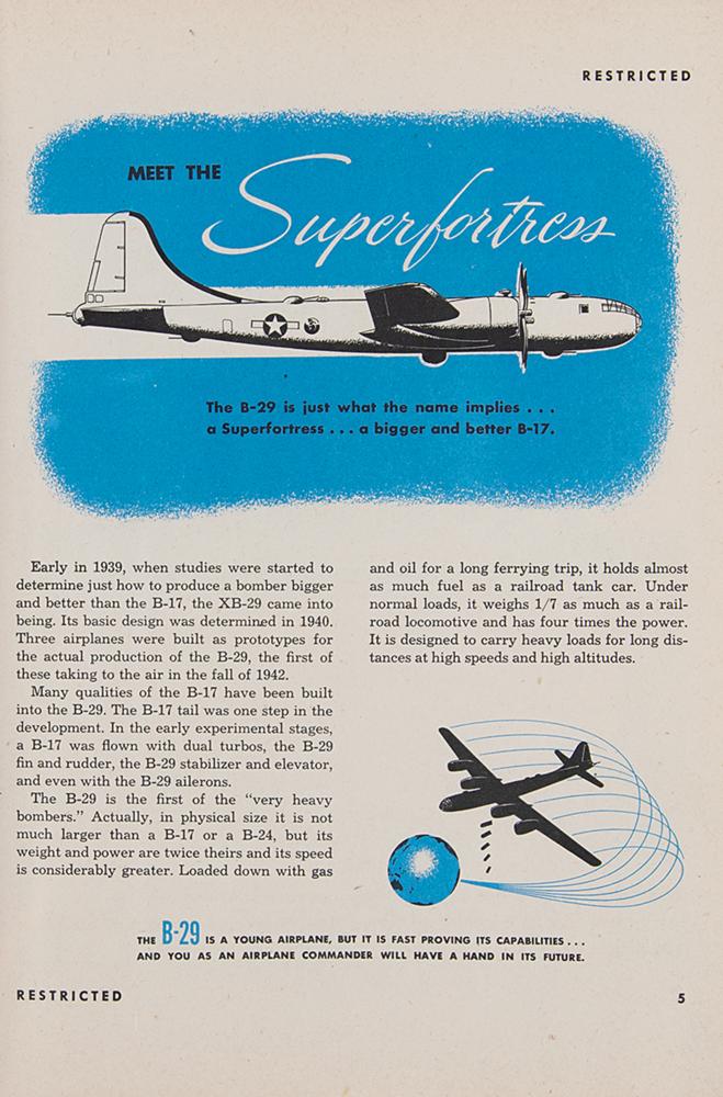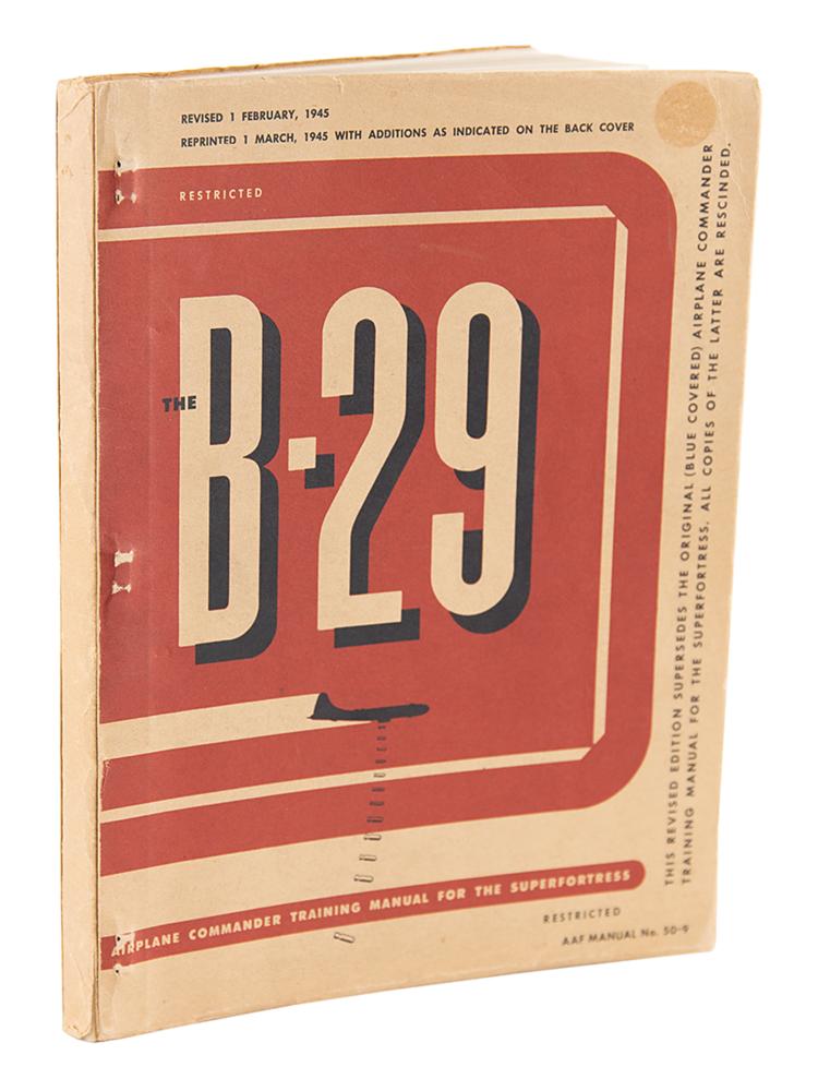 Softcover Boeing B-29 Superfortress Airplane Commander Training Manual (AAF Manual No. 50-9), marked as "Restricted," 8 x 10.5, 224 pages, reprinted March 1, 1945. The well-illustrated manual "serves the dual purpose of a training checklist and a working handbook," detailing the aircraft systems as well as techniques and procedures to be used by its commander. In fine condition, with minor splitting to spine and a small circular stain to the upper right corner of the front cover. A four-engined propeller-driven heavy bomber, the B-29 Superfortress was one of the largest and most advanced bombers used during World War II—B-29s dropped the atomic bombs on Hiroshima and Nagasaki, the only aircraft ever to drop nuclear weapons in combat.