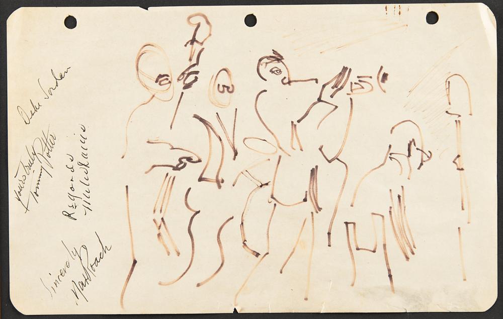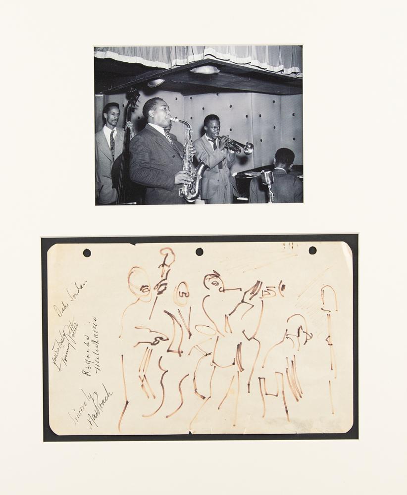 Vintage ink signatures of the Charlie Parker Quintet—Miles Davis, Max Roach, Tommy Potter, and Duke Jordan—on an off-white 9.5 x 6 notebook page bearing a felt tip sketch of the band playing live. Mounted and matted with a photo of the quintet to an overall size of 13 x 15.75. In fine condition, with some light stains. Accompanied by a full letter of authenticity from REAL.