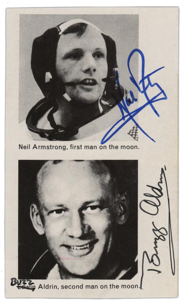 Desirable 2.75 x 4.75 photo of the Apollo 11 moonwalkers clipped from a book, signed in blue felt tip, "Neil Armstrong," and in black felt tip, "Buzz Aldrin." Aldrin also strikes through "Edwin" in the caption of his portrait, writing "Buzz" instead. In very fine condition. An ideal pairing of bright, bold autographs from these pioneering astronauts.