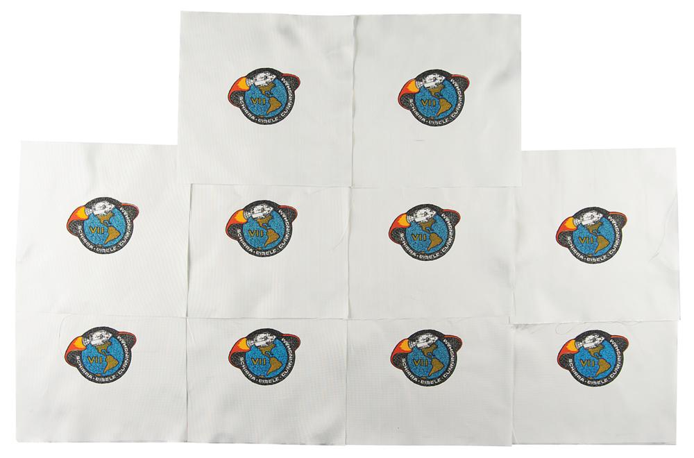 Group of Beta cloth swatches, all about 9 x 9, featuring the Apollo 7 mission insignia at center, showing the CSM orbiting Earth with the surnames of the crew in the border: "Schirra - Eisele - Cunningham." In very fine condition.