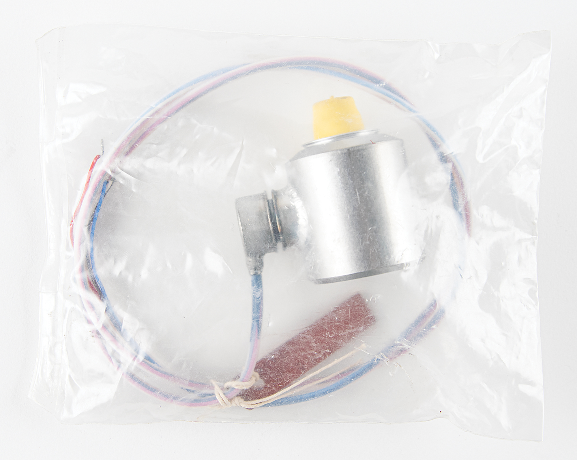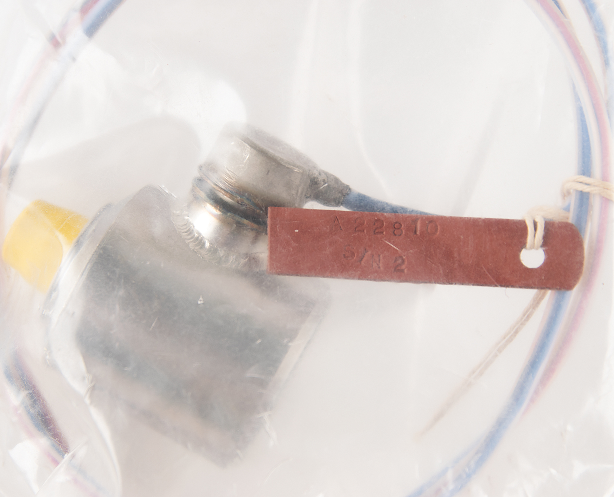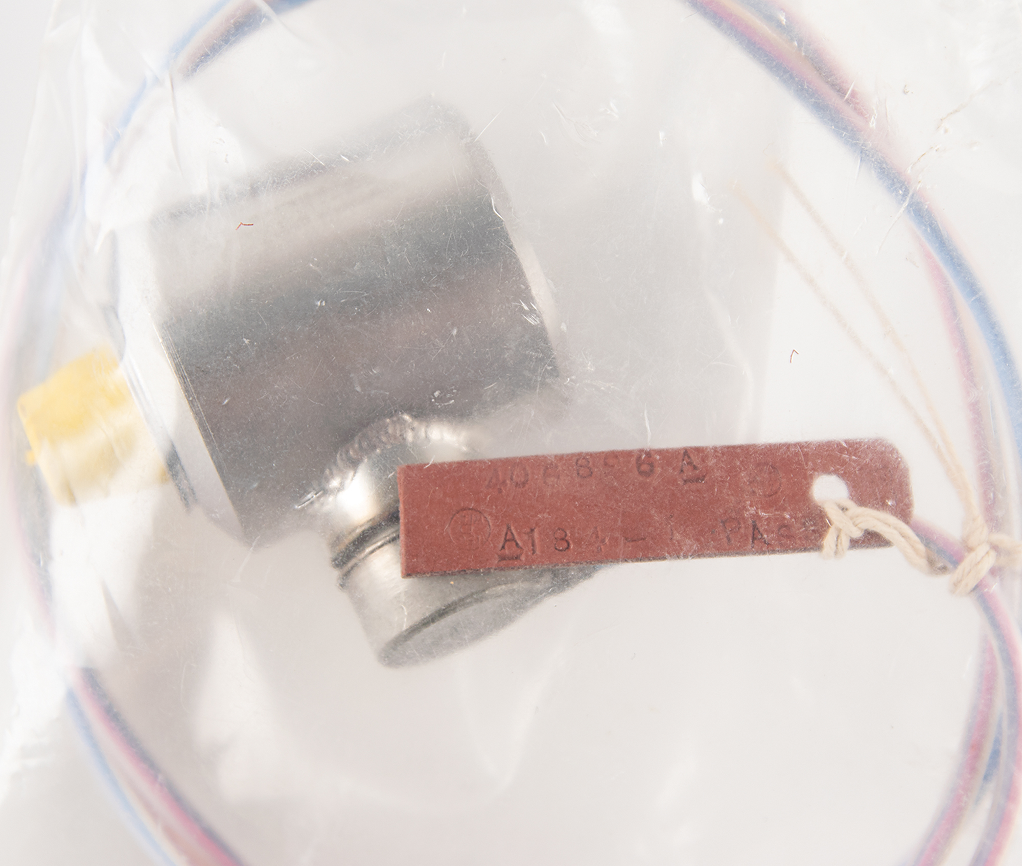 Apollo SE-8 Reaction Control Thruster Solenoid, measuring 2.5″ x 2.5″ x 1.5″ plus attached wiring harness, with a quality inspection label attached, reading: "406896A, A184-1 Pass" and "A22810, S/N 2." Sealed in its original plastic and in fine condition.