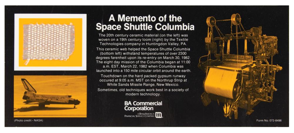 Souvenir card produced by BA Commercial Corporation, 8.5 x 3.5, containing a 1.5 x 1 swatch of woven ceramic fabric as used to protect the Space Shuttle Columbia. Headed "A Memento of the Space Shuttle Columbia," the card reads, in part: "The 20th century ceramic material (on the left) was woven on a 19th century loom (right) by the Textile Technologies company in Huntingdon Valley, PA. This ceramic web helped the Space Shuttle Columbia (bottom left) withstand temperatures of over 300 degrees farenheit upon its re-entry on March 30, 198. The eight day mission of the Columbia began at 11:00 a.m. EST, March 22, 1982 when Columbia was launched into a 150 mile circular orbit around the earth." In fine condition.