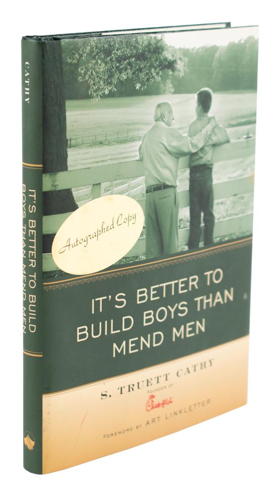 American businessman, investor, author, and philanthropist (1921-2014) who founded the fast food restaurant chain Chick-fil-A. Signed book: It's Better to Build Boys Than Mend Men. First edition. Decatur, Georgia: Looking Glass Books, 2004. Hardcover with dust jacket, 5.25 x 7.25, 117 pages. Signed on the first free end page in black felt tip by S. Truett Cathy. In very fine condition.