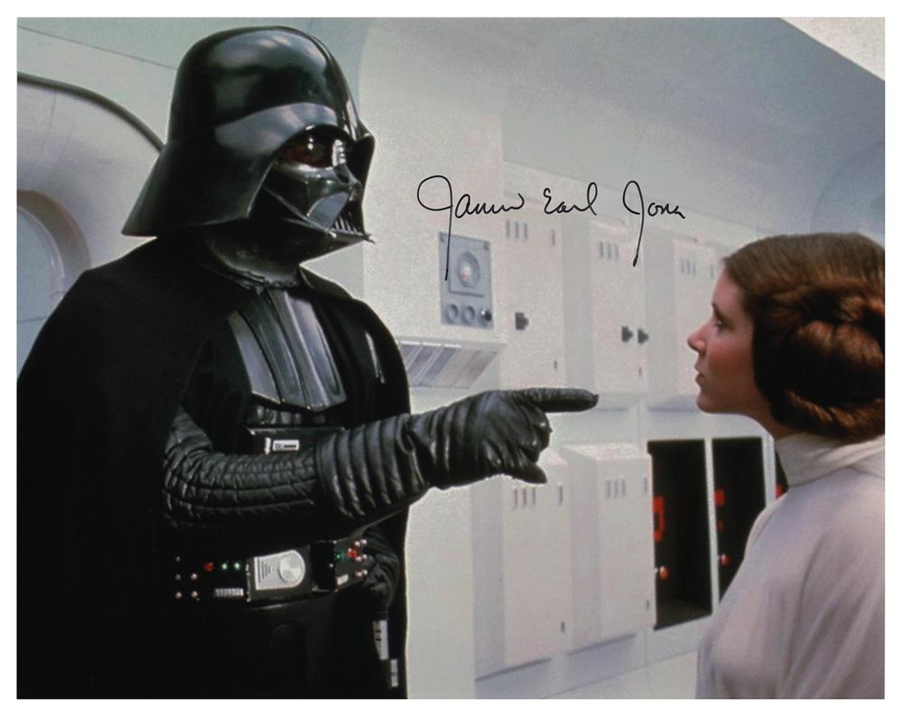 Color satin-finish 10 x 8 photo of Darth Vader pointing at Princess Leia in a scene from Star Wars, signed in black felt tip, "James Earl Jones." In very fine condition.