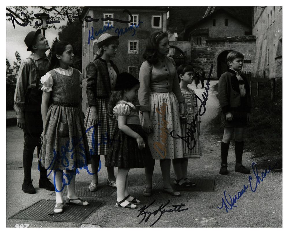 Uncommon satin-finish 10 x 8 photo of the cast of the von Trapp children in The Sound of Music, fully signed in ink by Nicholas Hammond, Heather Menzies, Angela Cartwright, Duane Chase, Kym Karath, Debbie Turner, and Charmian Carr. In very fine condition.