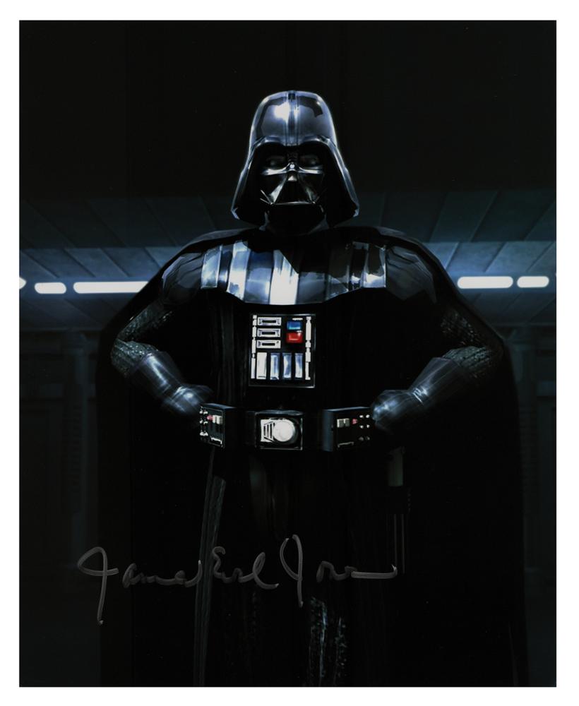 Color satin-finish 8 x 10 photo of iconic Star Wars villain Darth Vader, signed in silver ink, "James Earl Jones." In very fine condition.