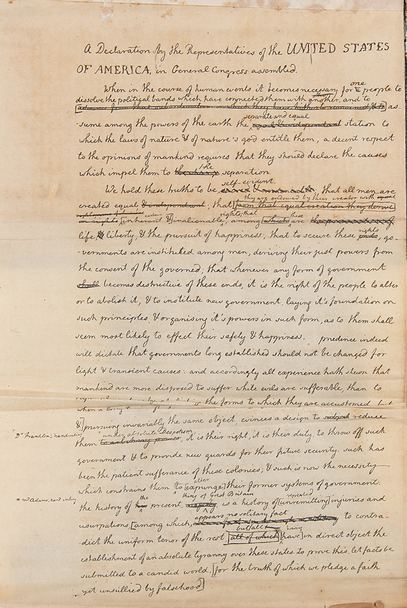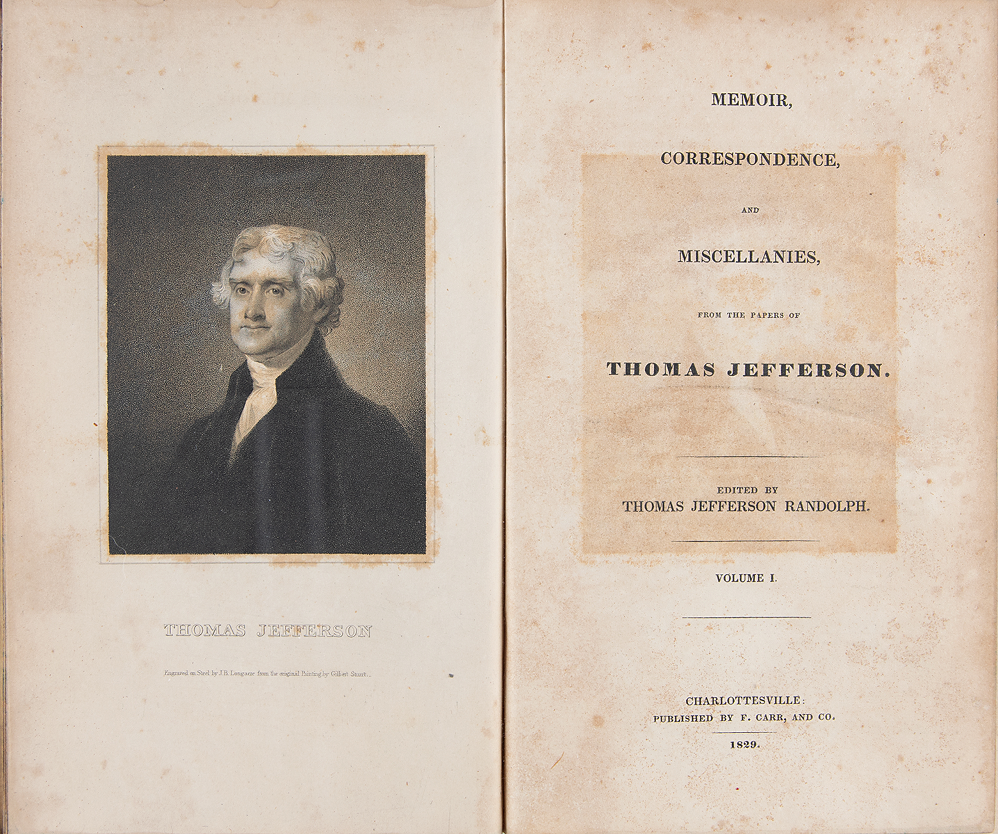 Four-volume set of The Writings of Thomas Jefferson, entitled ‘Memoir, Correspondence, And Miscellanies, From The Papers Of Thomas Jefferson,’ Edited by Thomas Jefferson Randolph. Early printing published in Charlottesville, Virginia, by F. Carr and Co., in 1829. Hardcovers half bound with green morocco leather and marbled boards and textblock edges, 5.75 x 8.5, 2017 total pages, with the first volume containing an engraved frontispiece of Gilbert Stuart’s portrait of Jefferson, and the fourth volume concluding with a four-page facsimile of Jefferson's rough draft of the Declaration of Independence. Opening pages of the third and fourth volumes bear the ownership signature of Richmond journalist and bookseller Thomas Ritchie. Book condition: G+/None, with wear and rubbing to boards and extremities, moderate mottled foxing throughout, and general overall wear.