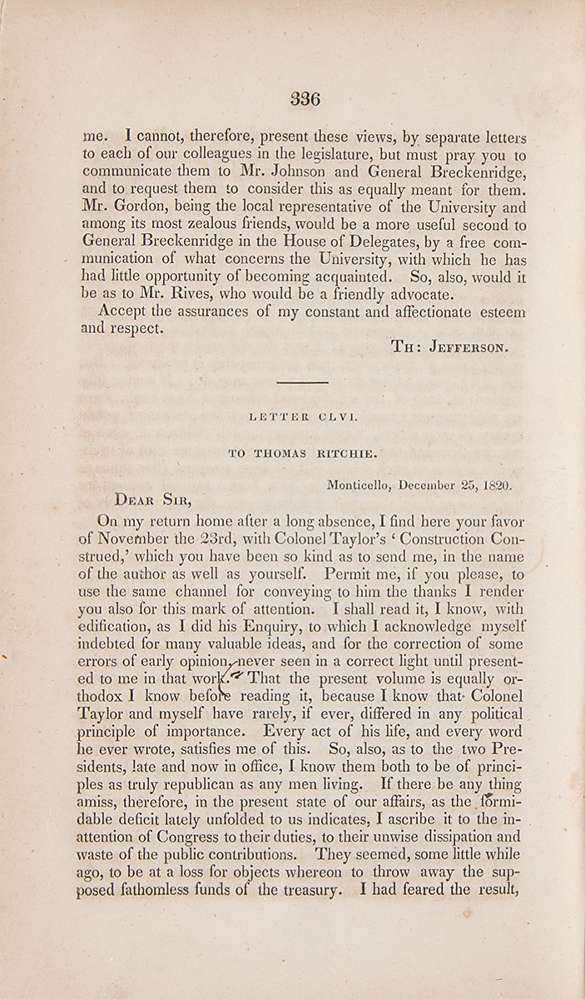 Ritchie (1778-1854) bought the Richmond Enquirer in 1804 and ran it as editor and publisher for 41 years, helping make it one of the most influential newspapers of the early 19th century. In a letter to William Short, dated September 8, 1823, Jefferson stated, ‘I read but a single newspaper, Ritchie's Enquirer, the best that is published or ever has been published in America.’ Ritchie and Jefferson corresponded frequently, as is evidenced in Vol. 4 on page 336, with a letter sent by Jefferson to Ritchie on December 25, 1820, thanking him for sending him a copy of Taylor's Construction Construed.