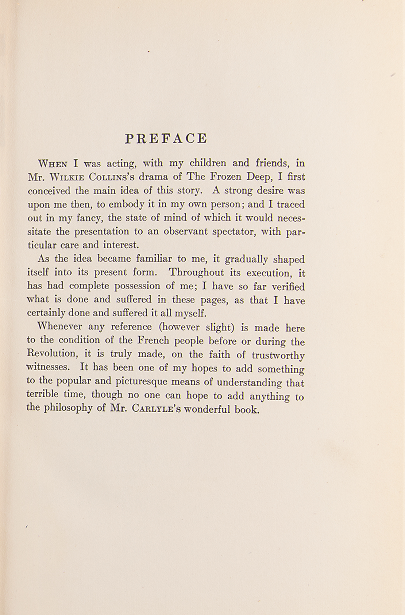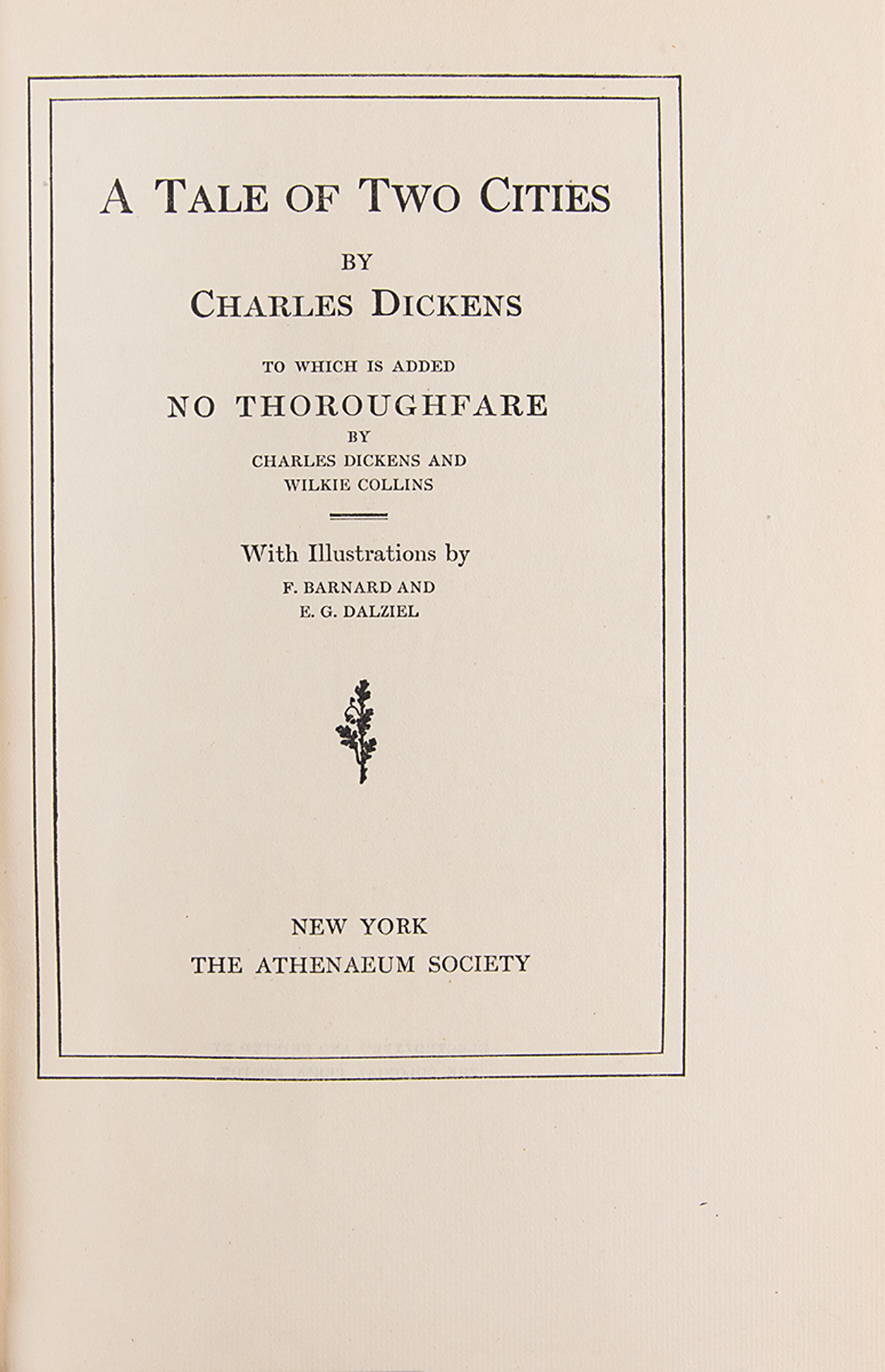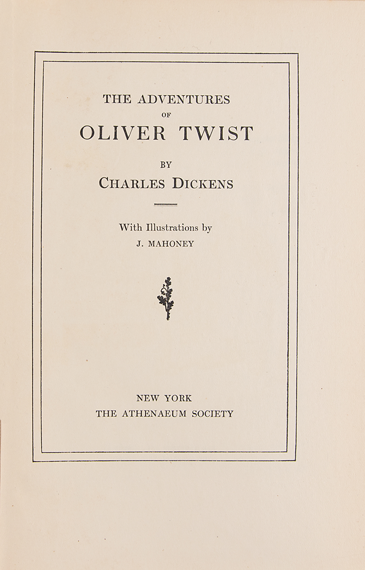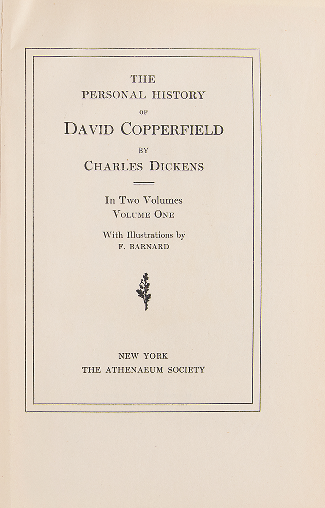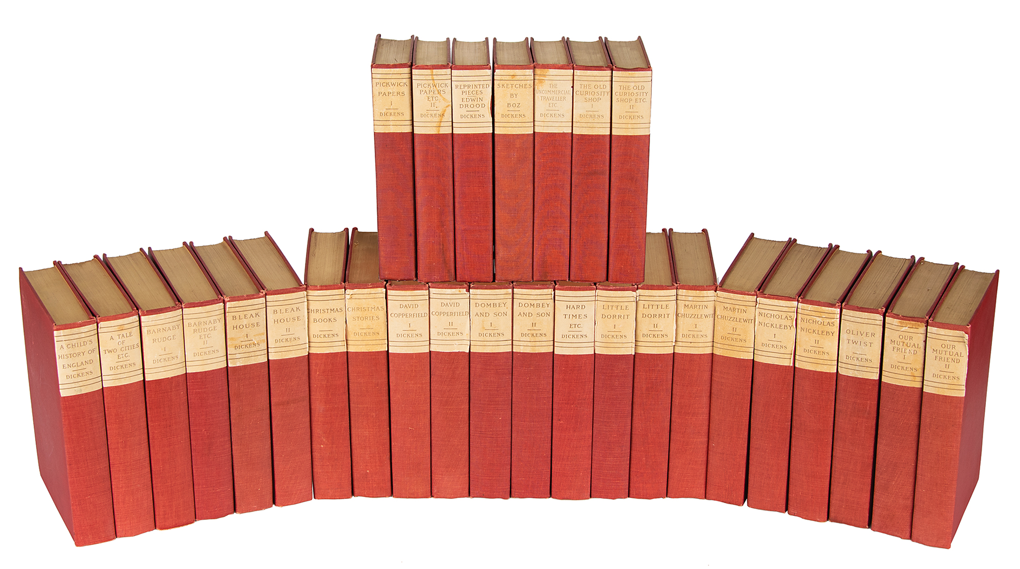Uncommon 29-volume hardcover collection of the works of Charles Dickens, unsigned, published by The Athenaeum Society of New York and electrotyped and printed by the Colonial Press of Boston, undated. Each volume, 5.75 x 8.25, features an affixed paper title to the upper spine, which read as follows: Barnaby Rudge I; Barnaby Rudge Etc. II; Bleak House I and II; A Child’s History of England; Christmas Books; Christmas Stories; David Copperfield I and II; Dombey and Son I and II; Hard Times Etc.; Little Dorrit I and II; Martin Chuzzlewit I and II; Nicholas Nickleby I and II; The Old Curiosity Shop I; The Old Curiosity Shop Etc. II; Oliver Twist; Our Mutual Friend I and II; Pickwick Papers I; Pickwick Papers Etc. II; Reprinted Pieces: Edwin Drood; Sketches by Boz; A Tale of Two Cities Etc.; and The Uncommercial Traveler Etc. In overall very good to fine condition, with wear and dings to boards of a few volumes.