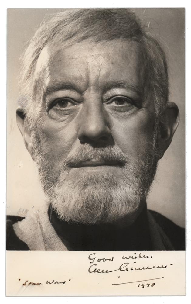 Matte-finish 5 x 8 close-up photo of Alec Guinness as the powerful Obi-Wan Kenobi, signed in the lower border in fountain pen, "Good wishes, Alec Guinness, 'Star Wars,' 1978." In very good to fine condition, with faint toning and speckled staining, and two professionally repaired punch holes to the left edge. A desirable example given the actor's rare addition of "Star Wars."