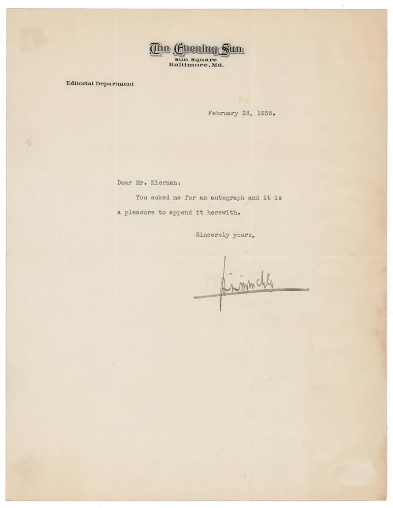 Popular and influential American author and journalist (1880-1956) best known for his satirical pieces that took aim at contemporary American society. TLS, one page, 8.5 x 11, The Evening Sun letterhead, February 28, 1938. Brief letter to a collector, in full: "You asked me for an autograph and it is a pleasure to append it herewith." In fine condition.