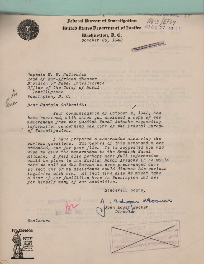 World War II-dated TLS, one page, 8 x 10.5, FBI letterhead, October 25, 1943. Letter to W. W. Galbraith, head of the Eur-African Theater, Division of Naval Intelligence, in full: “Your communication of October 2, 1943, has been received, with which you enclosed a copy of the memorandum from the Swedish Naval Attache requesting information concerning the work of the Federal Bureau of Investigation. I have prepared a memorandum answering the various questions. Two copies of this memorandum are attached, one for your file. It is suggested you may wish to give the memorandum to the Swedish Naval Attache. I feel also perhaps more full information could be given to the Swedish Naval Attache if he would care to call at the Bureau at some prearranged date so that one of my assistants could discuss his various inquiries with him. At that time also he might take a tour of our facilities here in Washington and see for himself many of our activities.” A routing slip is attached to the front and one of the referenced memorandums is attached to the reverse. Includes a Navy Department distribution letter with subject line, “Reciprocal Visits to Commercial plants by Nationals of the United States and Canada,” February 26, 1943, signed at the conclusion by James Forrestal. In fine condition.