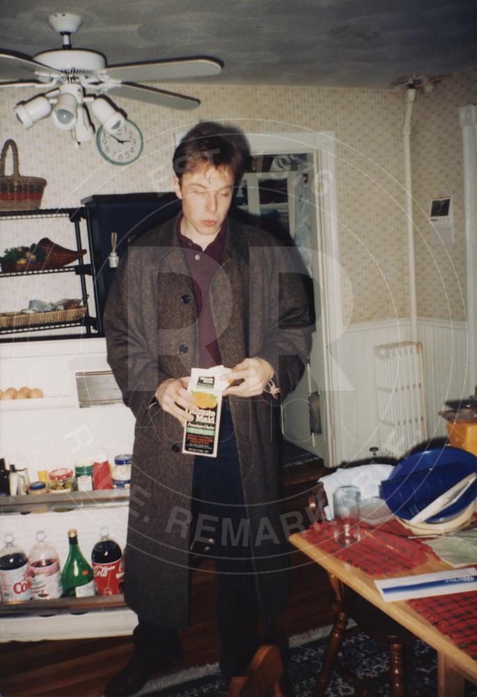 Original glossy 4 x 5.75 candid photo of Elon Musk in 1995, standing in a kitchen next to an open refrigerator door and opening a carton of orange juice. In very fine condition.
