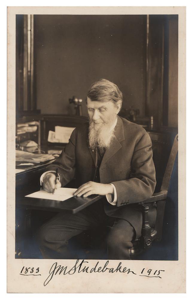 Pennsylvania Dutch co-founder and president of the Studebaker Corporation automobile company (1833-1917). The firm began as a coachbuilder for horse-drawn wagons, buggies, and carriages; it entered the automotive industry with electric vehicles in 1902, followed by gasoline-powered cars in 1904. Scarce vintage matte-finish 4.75 x 7.5 photo of Studebaker at work, signed in the lower border in ink, "J. M. Studebaker, 1833, 1915." In fine condition, with light silvering to the bottom edges of the image.