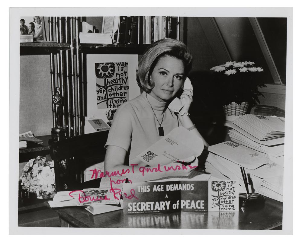 Academy Award-winning actress (1921-1986) remembered for her roles in It's a Wonderful Life and From Here to Eternity. Glossy 10 x 8 photo of Reed working for the grass-roots anti-war advocacy group Another Mother for Peace, signed in red felt tip, "Warmest good wishes from Donna Reed." In fine condition.