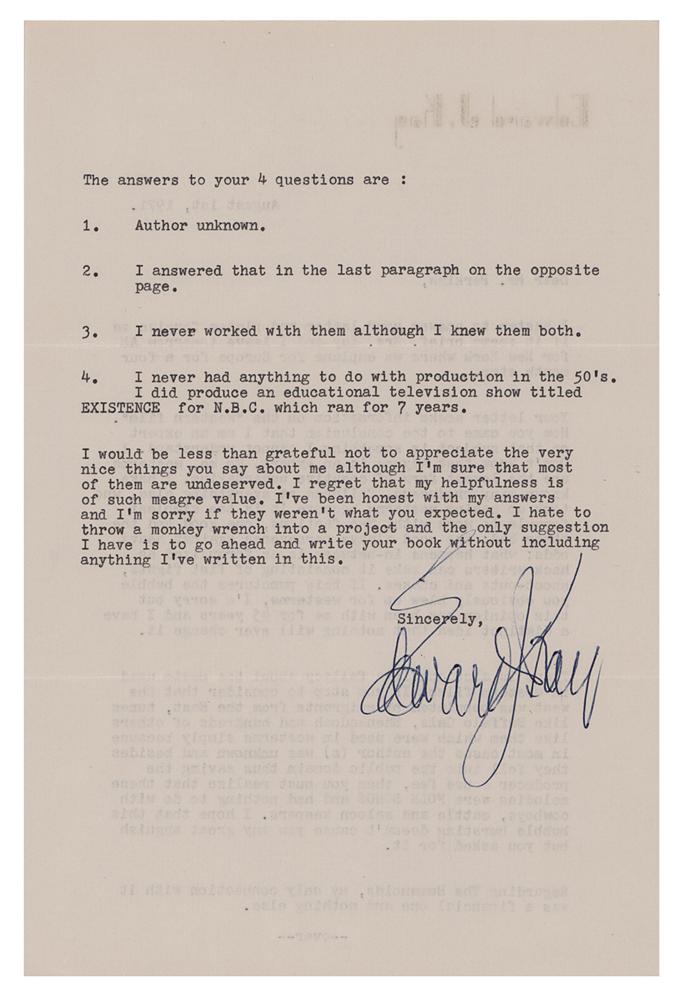 American film composer and musical director (1898-1973) nominated for five Oscars throughout the 1940s, though he never won. TLS, one page, 7.25 x 10.5, personal letterhead, August 1, 1971. Letter to "Mr. Perkins," in part: "Your letter seeks information on the 'western film.' How you came to the conclusion that I am an expert on that subject is something I cannot understand. I don't know that anyone is an expert. To me, westerns are the lowest form of creative undertaking. I have known many producers, failures at everything else, who took up making westerns because it is the simplest formula to work with. Two factions, one good and the other bad; the good always perseveres against heavy odds; what happens in-between is as formulized as hack writers can make it consisting of fist fights, shoot-outs and chases. If this punctures the bubble you obviously blew up for westerns, I'm sorry but this opinion has been with me for 45 years and I have a distinct idea that nothing will ever change it.