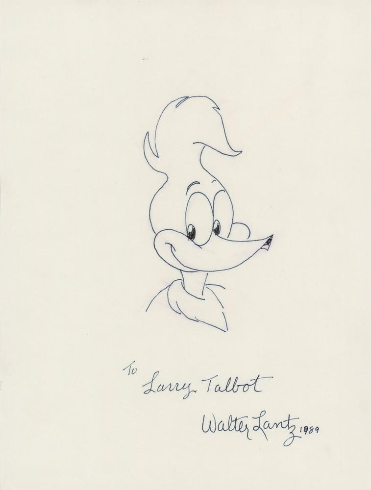 Original felt tip sketch of Woody Woodpecker accomplished by Lantz on a white 8.25 x 11 sheet, signed and inscribed below in black felt tip, "To Larry Talbot, Walter Lantz, 1989." In very fine condition.
