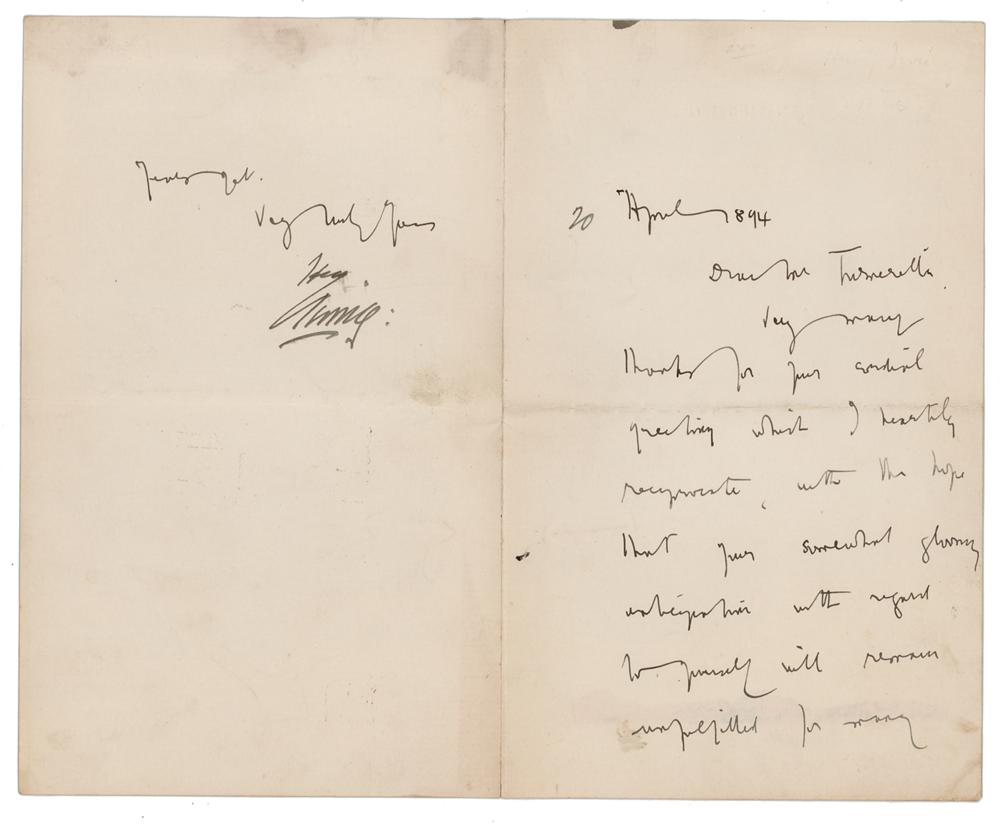 ALS signed “Henry Irving,” written in the hand of his secretary, Dracula author Bram Stoker, two pages on two adjoining sheets, 5 x 8, blindstamped Lyceum Theatre letterhead, June 11, 1894. Stoker writes, in part: "Very many thanks for your cordial greeting which I heartily reciprocate." In fine condition, with some minor show-through from mounting remnants on the back. Stoker worked as business manager for Henry Irving's world-famous Lyceum Theatre in London between 1879 and 1898, where he supplemented his income by writing a large number of sensational novels—his most famous being the vampire tale Dracula, published in 1897.