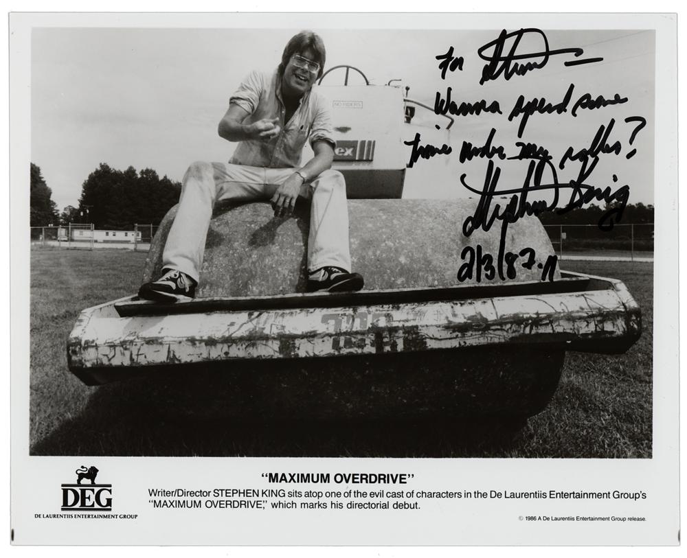 Glossy 10 x 8 photo of Stephen King on the set of the 1986 comedy horror film Maximum Overdrive, signed and inscribed in black felt tip, "For Steve—Wanna spend some time under my roller? Stephen King, 2/3/87.” In fine condition.