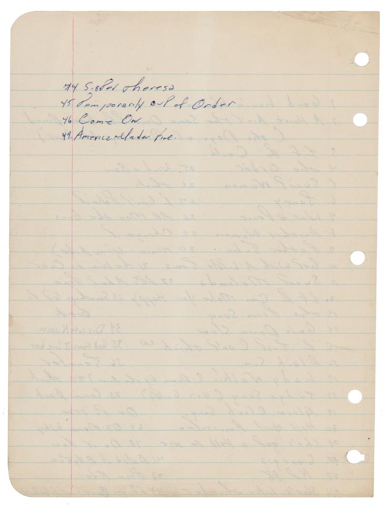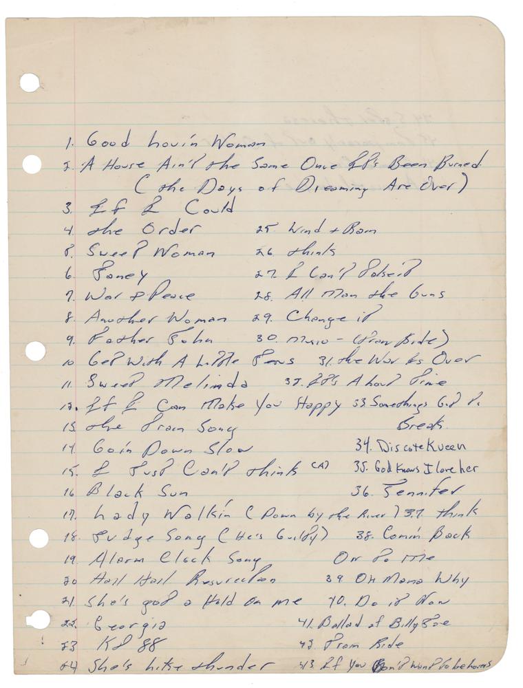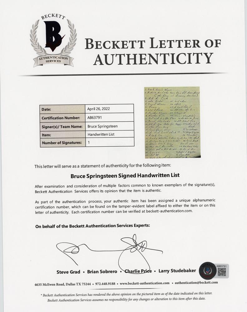 Unusual handwritten song list by Bruce Springsteen, one page both sides, 7.75 x 10.5, no date. Desirable handwritten list naming the titles of 47 songs, including several early Springsteen songs from his time with Steel Mill; among the songs listed a "Good Lovin' Woman," "Janey," "Sweet Melinda," "The Train Song," "Goin' Down Slow," "Black Sun," "Hail Hail Resurrection," "Georgia," "All Man the Guns," "Oh Mama Why," "Train Ride," "Sister Theresa," "Temporarily Out of Order," "Come On," and "America Under Fire." In fine condition. Accompanied by a full letter of authenticity from Beckett Authentication Services. Steel Mill was an early Springsteen band active from 1969 to 1971, which included three future members of the E Street Band—Vini Lopez, Danny Federici, and Steve Van Zandt.
