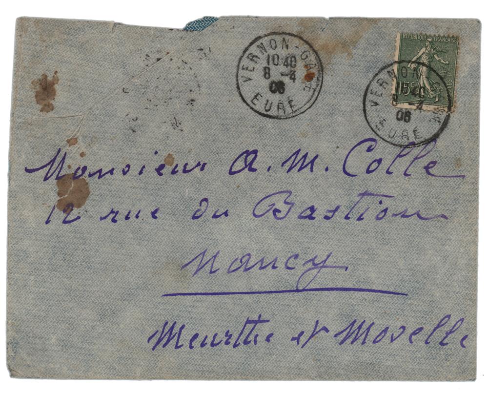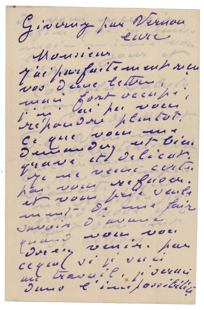 ALS in French, two pages both sides, 5.25 x 8, April 8, 1906. Handwritten letter from his Giverny gardens to the painter Michel-Auguste Colle, with a critical comment on the use and overuse of the word 'Impressionism.' In full (translated): "I have perfectly received your two letters but, being very busy, have been unable to reply sooner. The matter about which you ask me is quite serious and delicate. I surely do not want to refuse, and only pray you to tell me beforehand when you would like to come for, if I should be at work, it would impossible for me to receive you. I would therefore have to decide the day and time?P.S. You seem to singularly stick to this title of ‘impressionist’, which does not mean much and has made people tell so much nonsense." In fine condition. Accompanied by the original mailing envelope, addressed in Monet's hand.