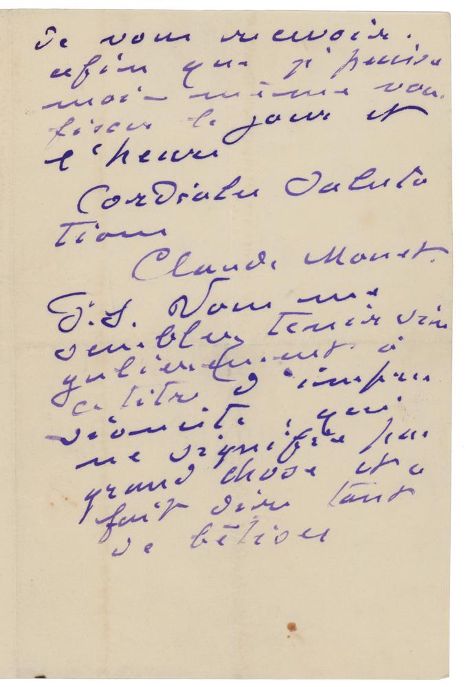 This letter reflects in a remarkable way what Monet himself thought about the word 'Impressionist' more than thirty years after it was first used. More than one century later, the term is still widely used in spite of Monet’s rejection. This unique letter bears witness in a most striking manner to the discrepancy between the way in which the history of one of the most important artistic movements has been written and the vision held by its leading member.