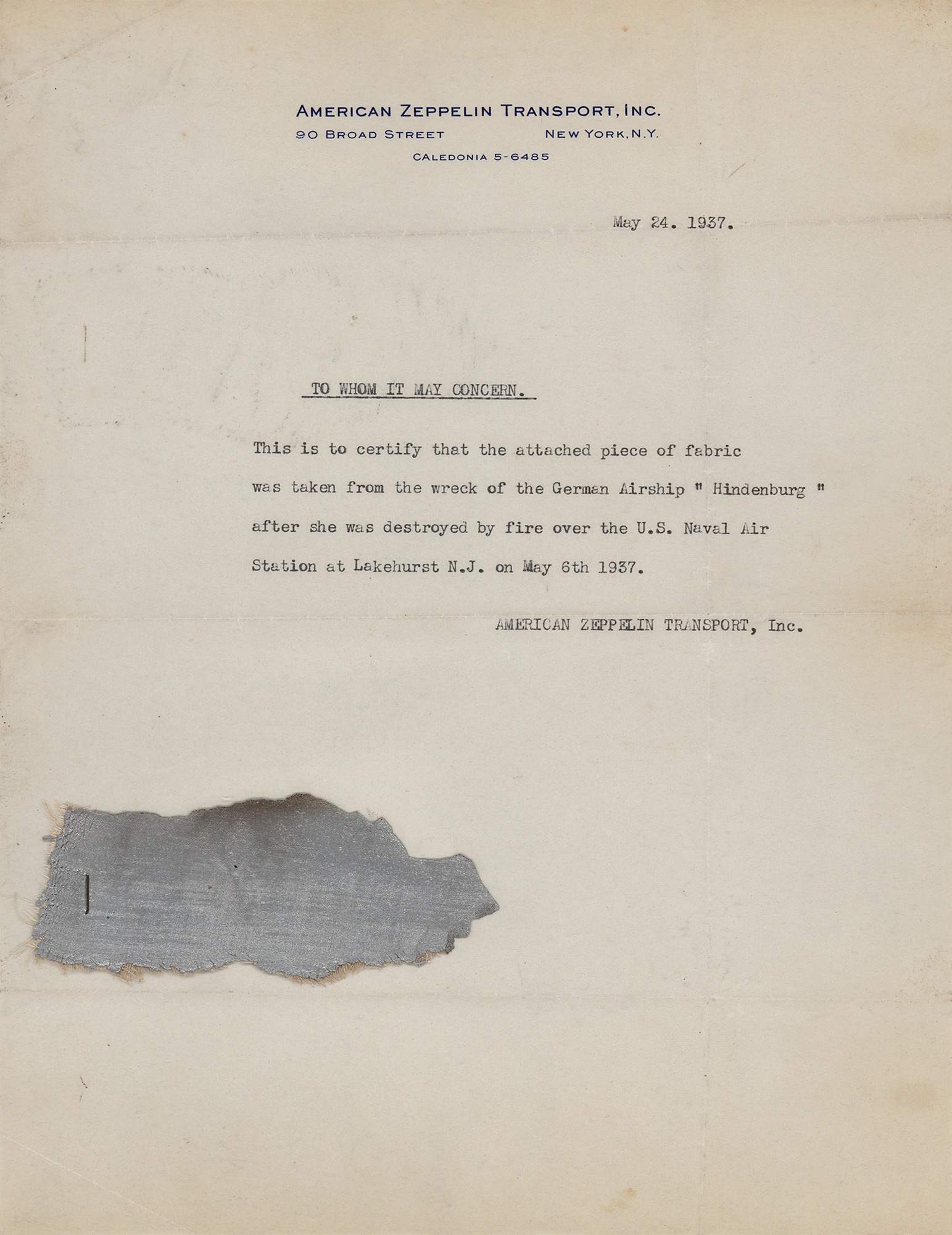 Sizable 4 x 1.75 swatch of the silver-colored hull of the LZ 129 Hindenburg, which caught fire when it attempted to dock with its mooring mast at Naval Air Station Lakehurst in Manchester Township, New Jersey on May 6, 1937. The swatch is stapled to a typed letter from American Zeppelin Transport, Inc., 8.5 x 11, dated May 24, 1937, which reads: “This is to certify that the attached fabric was taken from the wreck of the German Airship ‘Hindenburg’ after she was destroyed by fire over the U.S. Naval Air Station at Lakehurst N.J. on May 6th 1937.” In fine condition.
