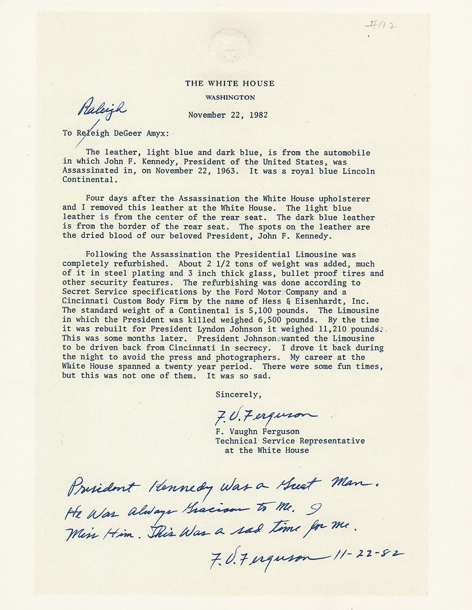 Uncommon .25″ x .25″ swatch of dark blue seat leather from the 1961 Lincoln Continental X-100 presidential limousine Kennedy was riding in at the time of his assassination. In fine condition. Accompanied by a copy of a letter of provenance from F. Vaughn Ferguson to noted collector Raleigh DeGeer Amyx for a 1982 sale of two large pieces of JFK limo leather, as well as other paperwork related to the assassination and to Ferguson, a technical service representative at the White House whose primary responsibility was the care of the presidential limousine. He was the only person permitted continual hands-on contact with the 1963 presidential limousine after the tragic assassination of our president. Ferguson was able to retain the removed leather sections and then the presidential limousine was sent to a Cincinnati firm for refitting and a security upgrade.