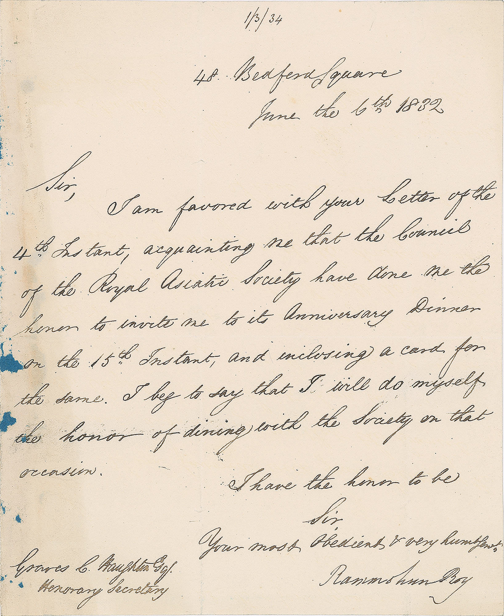 Indian reformer (1772-1833) who challenged traditional Hindu culture and first introduced the word Hinduism into the English language in 1816. LS signed "Rammohun Roy," one page, 7.25 x 9, June 6, 1832. Letter to Graves C. Haughton, Honorary Secretary of the Royal Asiatic Society. In full: "I am favored with your Letter of the 4th Instant, acquainting me that the Council of the Royal Asiatic Society have done me the honor to invite me to its Anniversary Dinner on the 15th Instant, and inclosing a card for the same. I beg to say that I will do myself the honor of dining with the Society on that occasion." In fine condition, with light staining along the left edge from old mounting remnants on the reverse.